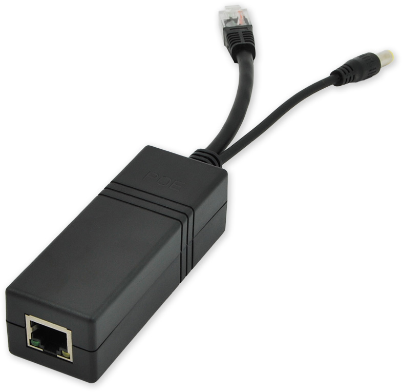 PoE splitter slouží k oddělení PoE napájení z datového kabelu, datový tok je dále veden samostatně, napájení je redukováno na 12 V= a odděleno na výstup napájecího konektoru 5,5 x 2,1 mm.