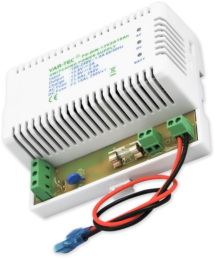 Spínaný zdroj na DIN lištu s výstupním napětím 13,8 V/2 A v plastovém krytu. Napájení přímo 230 V, výstup pro připojení záložního akumulátoru (0,5 A, max. 18 Ah).