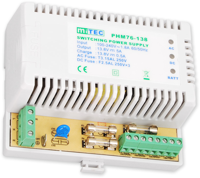 Spínaný zdroj na DIN lištu s výstupním napětím 13,8 V/5 A v plastovém krytu. Napájení přímo 230 V, výstup pro připojení záložního akumulátoru (0,5 A, max. 18 Ah).