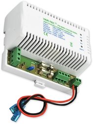 Spínaný zdroj na DIN lištu s výstupním napětím 13,8 V/3 A v plastovém krytu. Napájení přímo 230 V, výstup pro připojení záložního akumulátoru (0,5 A, max. 18 Ah).