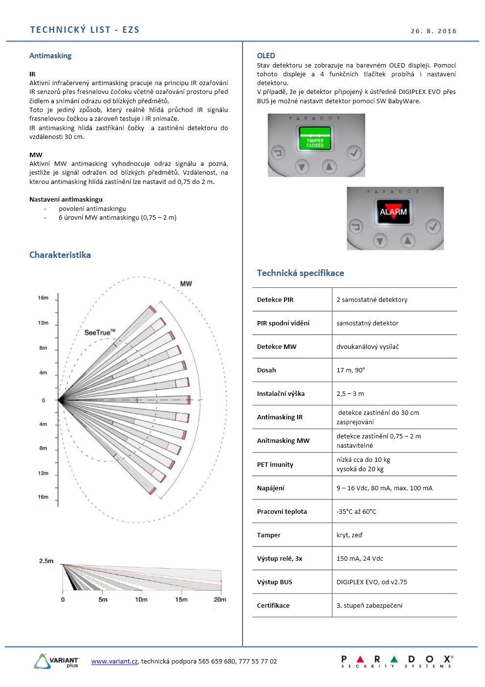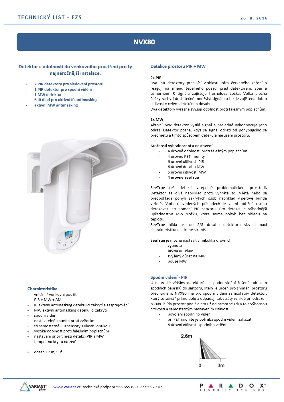 Venkovní detektor v provedení HIGH-TECH pro náročná prostředí, 2 x QUAD PIR pro detekci v prostoru, 1 x QUAD PIR pro spodní vidění, 1 x 2 kanálový MW detektor, aktivní IR antimasking hlídající degradaci čočky a zastínění bližší než 30 cm, nastavitelný MW antimasking 0,75 - 2 m, nastavitelné úrovně odolnosti proti zvířatům, automatická diagnostika PIR, MW a antimaskingu, SW nastavení detektoru pomocí inteligentního menu a přehledného barevného OLED displeje. Součástí balení je držák na zeď a stříška.