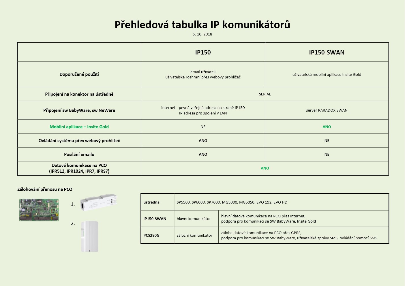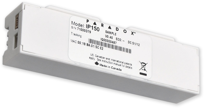 Modul určený pro komunikaci s ústřednami SP/MG/EVO přes LAN / INTERNET. Pro síťovou komunikaci je použit chráněný protokol HTTPS pro kryptování emailů je podpora SSL. Modul IP150 obsahuje web server a lze jej využít pro základní uživatelské ovládání nebo monitorování ústředny z libovolného PC v síti LAN/internet. ON-line monitorování stavu podsystémů a zón. Posílání emailů z ústředny při zapnutí/vypnutí, poplachu, poruše a lze zobrazovat posledních 64 událostí historie. Dále je možné modul využít pro plné programování instalační firmou dálkově přes LAN/internet pomocí SW WINLOAD / BABYWARE / NEWARE. IP150 obsahuje dvě svorky s možností nastavení jako vstup nebo výstup. Pomocí vstupu lze načítat stav a zobrazovat na PC nebo z PC ovládat výstupy a tím další zařízení. Komunikace po LAN/Internet s PCO nadstavbou IPR1024 nebo sw. přijímačem IPRS7.