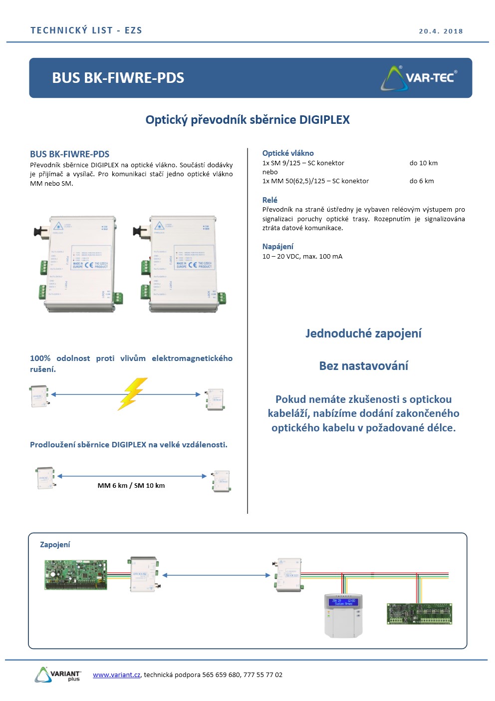 Digitální převodník pro MM nebo SM vlákna s SC konektorem, v ceně dodávky jsou dva moduly přijímač/vysílač. Převodník umožňuje převést sběrnici BUS ústředen EVO na optické vlákno a zpět na BUS s metalickým vedením. Použitím optických vláken je výrazně zvýšen dosah sběrnice PARADOX (SM až 5 km), zajištěna odolnost proti elektromagnetickému rušení, včetně úplného galvanického oddělení.