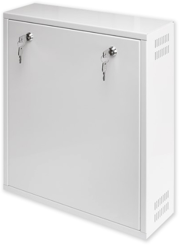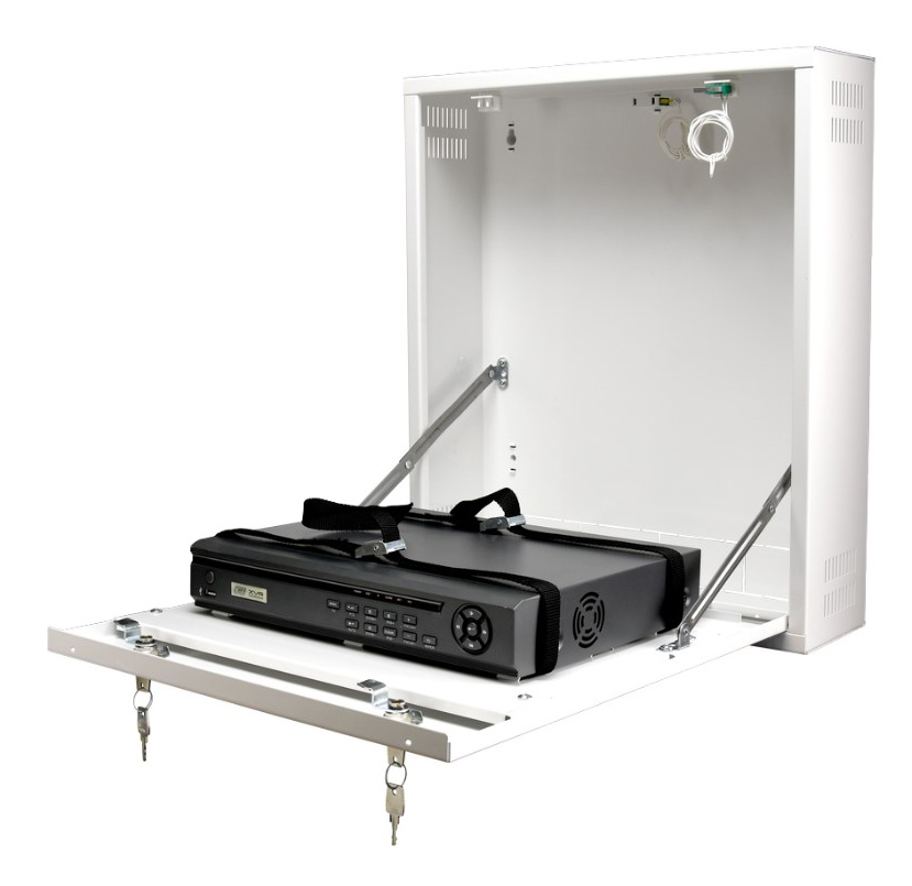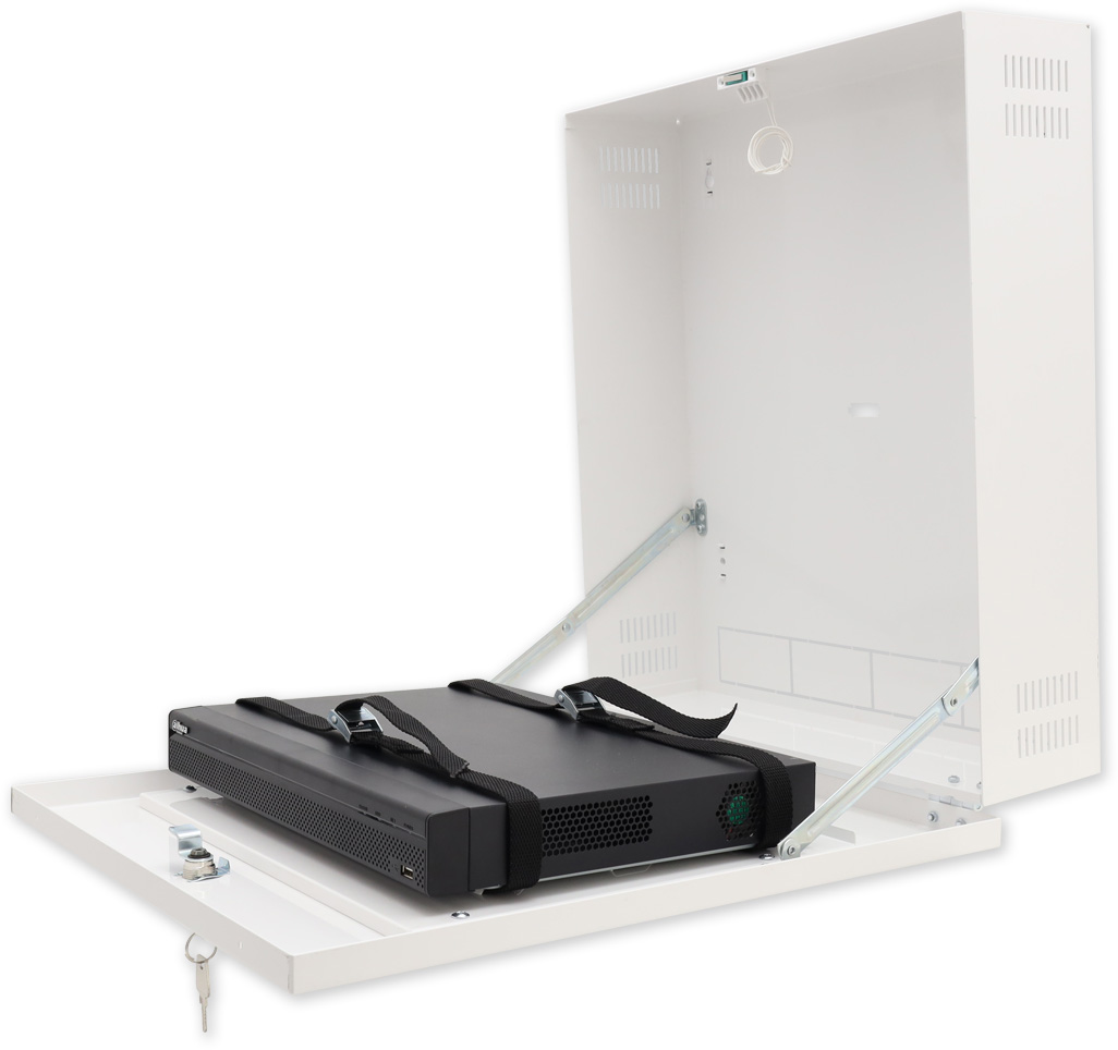 Nástěnný kovový box pro uzamčení záznamového nebo jiného zařízení, univerzální uchycení pro zařízení o rozměrech až š 375 x v 335 x h 95 mm, zabezpečení zámkem a dveřním tamperem.