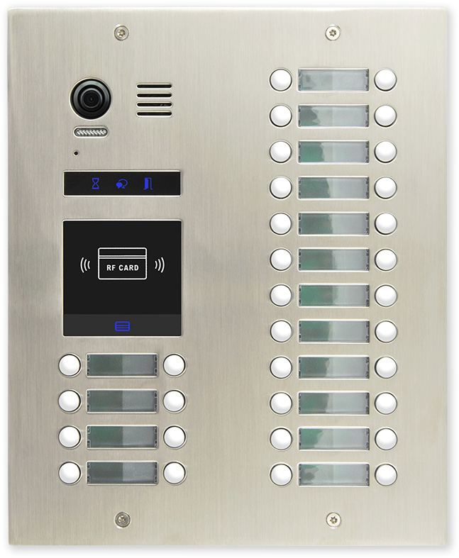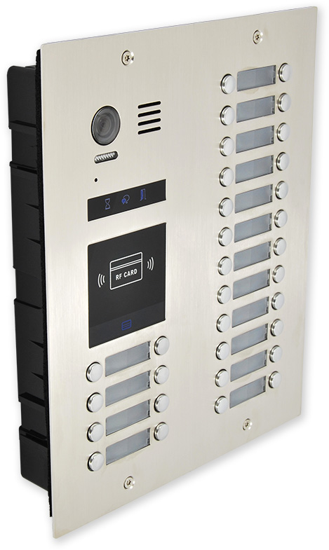 Venkovní zápustná dveřní jednotka s kamerou pro více účastníků řady V-LINE s 32 tlačítky a čtečkou, reproduktorem a mikrofonem.