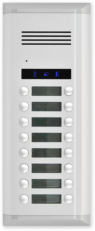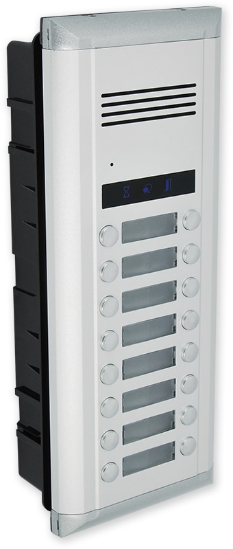 Venkovní dveřní audio jednotka s 16 vyzváněcími tlačítky, reproduktorem a mikrofonem. Počet vyzváněcích tlačítek lze rozšířit pomocí tlačítkových expandérů VE24 na max. 64 adres. !POZOR: POKUD PLÁNUJETE SYSTÉM, KDE BUDE VÍCE NEŽ 32 VNITŘNÍCH JEDNOTEK, KONTAKTUJTE PŘED NÁKUPEM ODDĚLENÍ EVS!