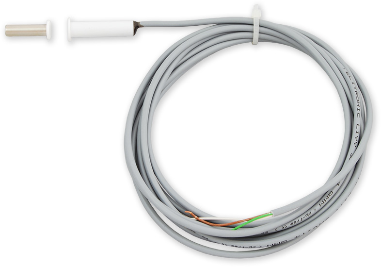 Magnetický kontakt pro systémy MAR s přepínacím kontaktem, zápustné provedení, třídrátový přívodní kabel v délce 3 metry, rozměry 8 x 33 mm, pracovní vzdálenost 0 - 22 mm.