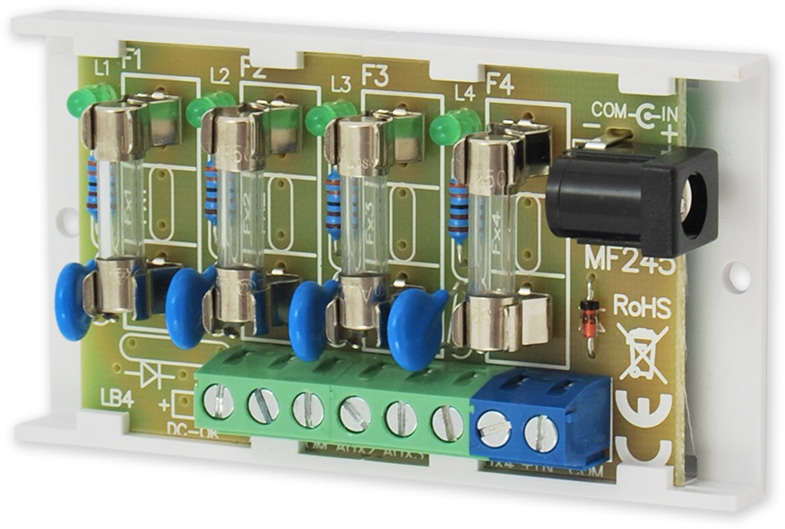 Přídavná rozbočovoací svorkovnice s 4x tavnou pojistkou 0,5 A. Napětí na výstupech je odděleně signalizováno LED.