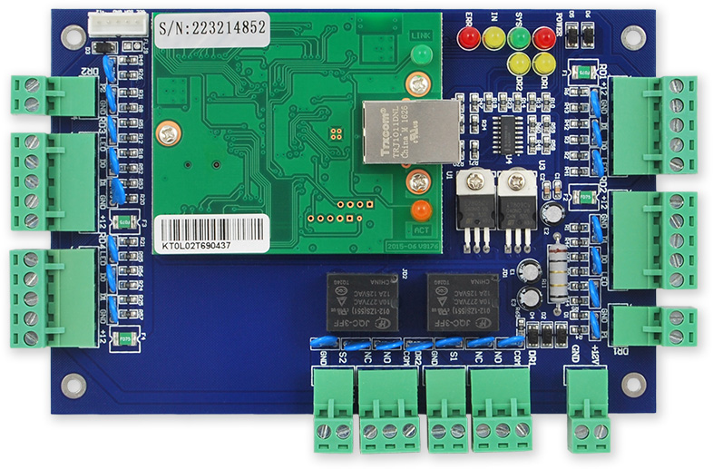 Řídící jednotka (pouze deska plošného spoje) přístupu pro dvoje dveře. Řídící jednotka má dvě výstupní relé pro ovládání zámků, je možné připojit 4 čtečky s výstupem Wiegand 26 bitů pro oboustranné ovládání dvou dveří.