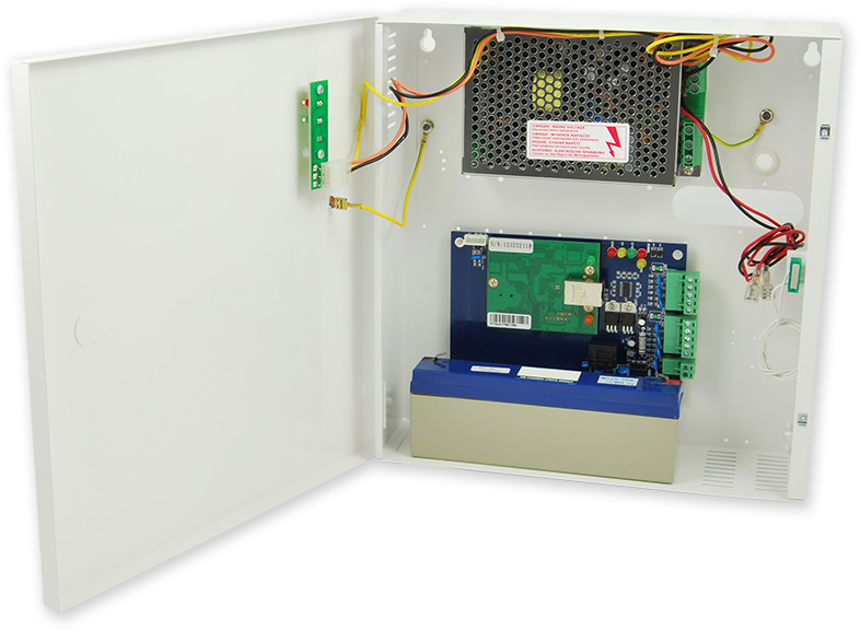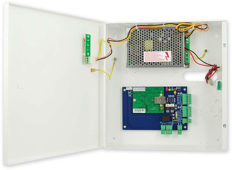 Řídící jednotka (v plechovém boxu s napájecím 3 A zdrojem) přístupu pro jedny dveře. Řídící jednotka má jedno výstupní relé pro ovládání zámku, je možné připojit 2 čtečky s výstupem Wiegand 26 bitů pro oboustranné ovládání jedněch dveří.
