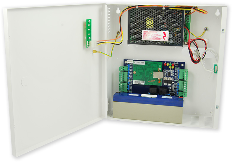 Řídící jednotka (v plechovém boxu s napájecím 3 A zdrojem) přístupu pro dvoje dveře. Řídící jednotka má dvě výstupní relé pro ovládání zámku, je možné připojit 4 čtečky s výstupem Wiegand 26 bitů pro oboustranné ovládání dvou dveří.