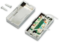Spojovací krabice Cat.5e STP se zářezovými svorkovnicemi typu LSA+ (Krone). K zapojení vodičů je nutné použít nástroje pro tento typ svorkovnice.