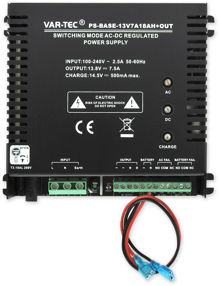 Přídavný spínaný zdroj s výstupním napětím 13,8 V/7 A a dobíjením 0,5 A pro akumulátor, napájení 230 V, výstupy pro signalizaci poruch AC a baterie.