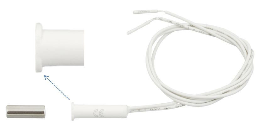 Dvoudrátový závrtný magnetický kontakt určený pro zápustnou montáž do oken, dveří atd.