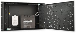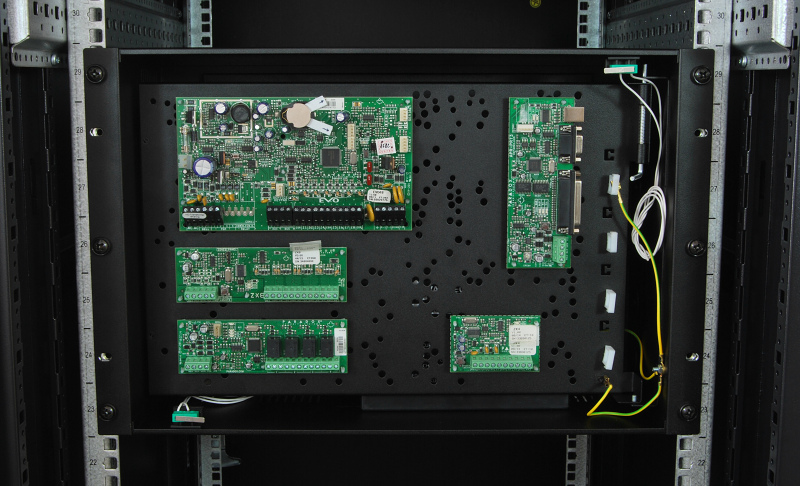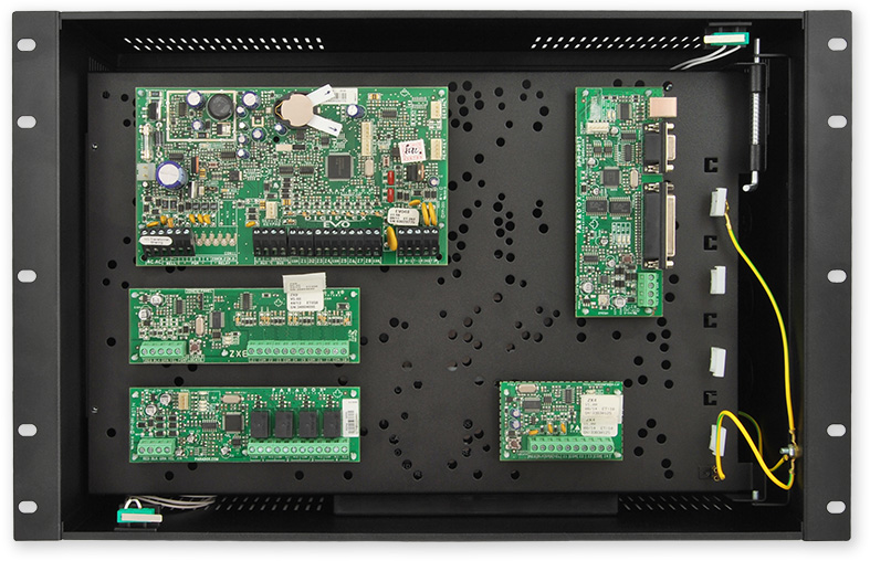 Univerzální plechový box pro ústředny SP/EVO nebo moduly, určený pro montáž do 19" datového rozvače. V otočné desce jsou umístěny přesné otvory pro vložení distančních sloupků k připevnění ústředen nebo modulů, v zádech boxu pak otvory pro přišroubování různých transformátorů. Box je rozvaděči uchycen 6 šrouby, dvířka zajišťují další 4 šrouby. Z bočních stran boxu jsou otvory pro vedení kabeláže, které jsou osazeny gumovými kryty. Součástí dodávky jsou 2 zasouvací tampery, 2 vodiče pro propojení napájení 16 V ~ z transformátoru do ústředny, zemnící vodiče se zemnící svorkou na boxu. Box RACK 19 je dodáván bez transformátoru. Do boxu je možné umístit akumulátor s kapacitou maximálně 18 Ah.