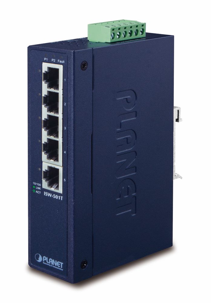 Průmyslový 5-portový switch 10/100BASE-TX, autodetekce rychlosti, kompaktní kovové provedení s krytím IP 30, vysoký teplotní rozsah, zemnící svorka.