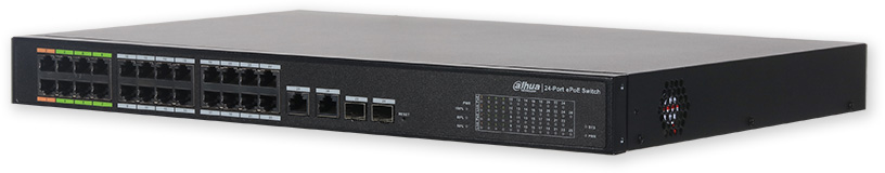 Výkonný 28 portový PoE switch s managementem. Prvních osm portů má ePoE standard pro napájení kamer až na vzdálenost 800 m po UTP nebo koaxiálním kabelu. PoE 24 x 10/100 Mbps, 2 x páteřní Gb a 2 x Gb SFP pro optickou kabeláž. Norma 3af (PoE), 3at (PoE+), Hi-PoE. Kovové provedení, rack 1U.