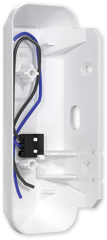 Plastový držák detektorů NV35/NV37 umožňuje instalaci, kdy je detektor směrován podél zdi. Kabeláž je vedena vnitřkem držáku, součástí je tamper sejmutí ze zdi.