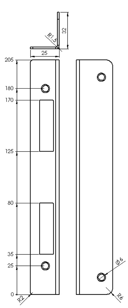 rozměry 205 x 25 x 32 mm síla 1,5 mm