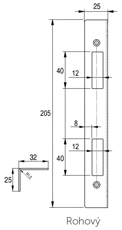 Rozměry: 205 x 25 x 32 mm síla 1,5 mm