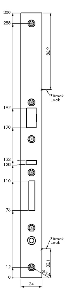 elo zámku určené pro samozamykací zámky ERBI s roztečí 92 mm (řady 9235 a 9245), zámek mimo osu A.