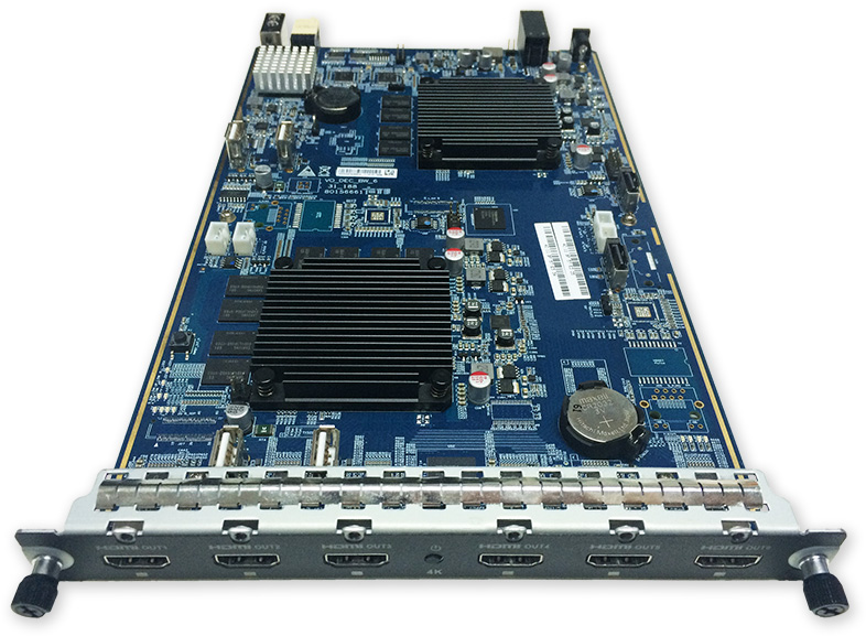 Videokarta do boxu videomatice slouží k dekódování a živému zobrazení videa na připojené LCD stěně. Video výstup 6 x HDMI, kódování H.265, maximální rozlišení 12 Mpix na kanál, maximální počet souběžně zobrazených kanálů je 150 při rozlišení D1.