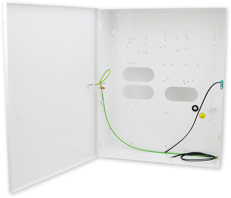 Velký univerzální plechový box pro všechny ústředny a moduly. V zádech boxu jsou umístěny přesné otvory pro vložení distančních sloupků k připevnění ústředen a modulů. Dvířka jsou uchycena pomocí nasouvacích pantů, na přední straně je předlisovaný otvor pro mechanický zámek. Ze zadní strany boxu jsou otvory pro uchycení na zeď, které jsou osazeny plastovými distančními sloupky. Součásti dodávky je tamper, 2 vodiče pro propojení napájení 16 V ~ z transformátoru do ústředny, zemnící vodiče se zemnící svorkou na boxu. Box VT je možné doplnit transformátory 40 VA nebo 80 VA.