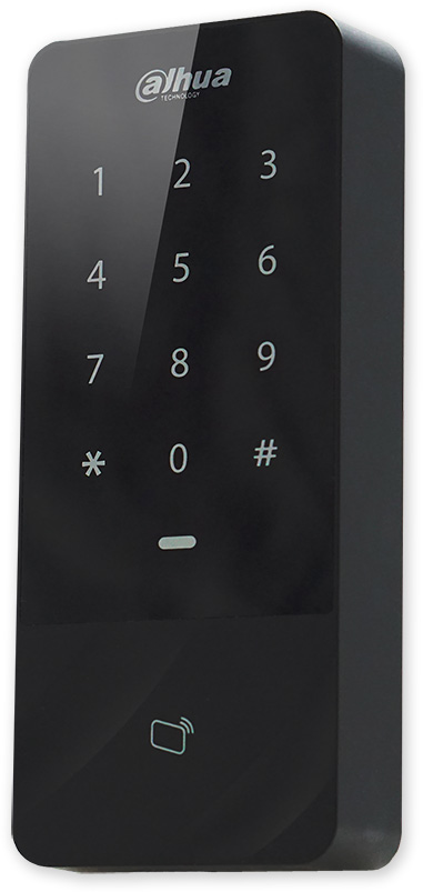 Autonomní čtečka karet s klávesnicí, možnost režimu MASTER-SLAVE s 2. externí čtečkou. Použití pro řízení obousměrného průchodu. Plastové provedení, vnitřní použití. Autorizace uživatele zadáním kódu, přiložením karty nebo potvrzení karty kódem. Pro obsluhu dveří je možné dále využít vstup pro odchodové tlačítko. Nastavení pouze SmartPSS Lite.