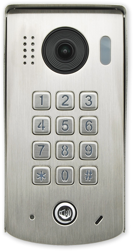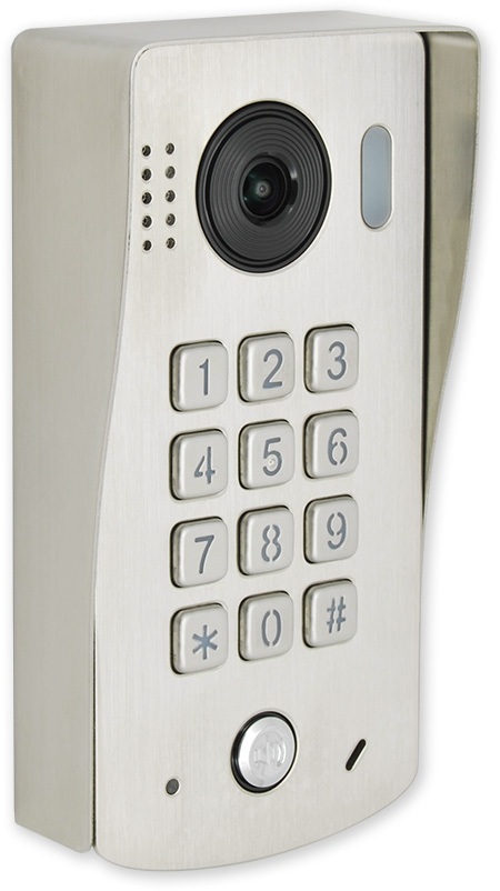 Venkovní dveřní jednotka s fisheye kamerou a mechanickou klávesnicí. Obsahuje kameru, LED přisvícení, tlačítko zvonku, mechanickou klávesnici pro ovládání relé dveřního zámku, reproduktor a mikrofon.
