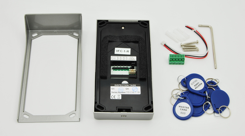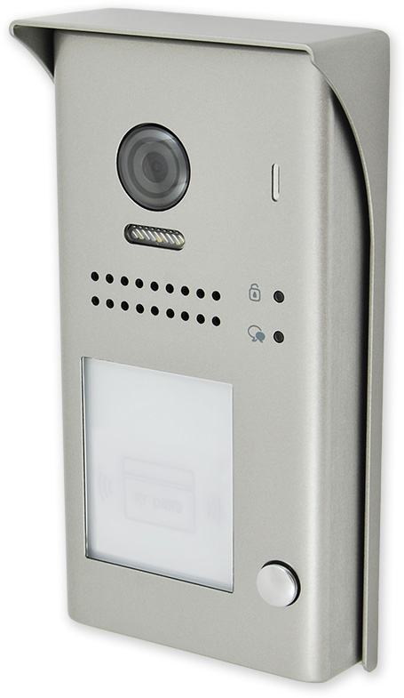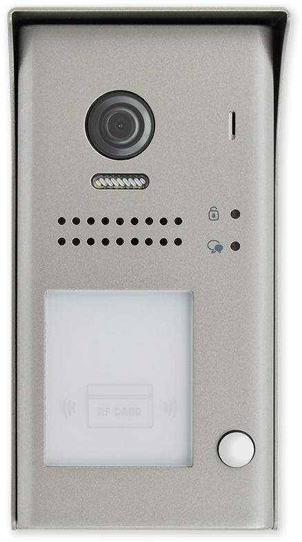 Venkovní dveřní jednotka s fisheye kamerou se 170° úhlem záběru a čtečkou karet. Obsahuje kameru, LED přisvícení, tlačítko zvonku, čtečku karet pro ovládání relé dveřního zámku, reproduktor a mikrofon.
