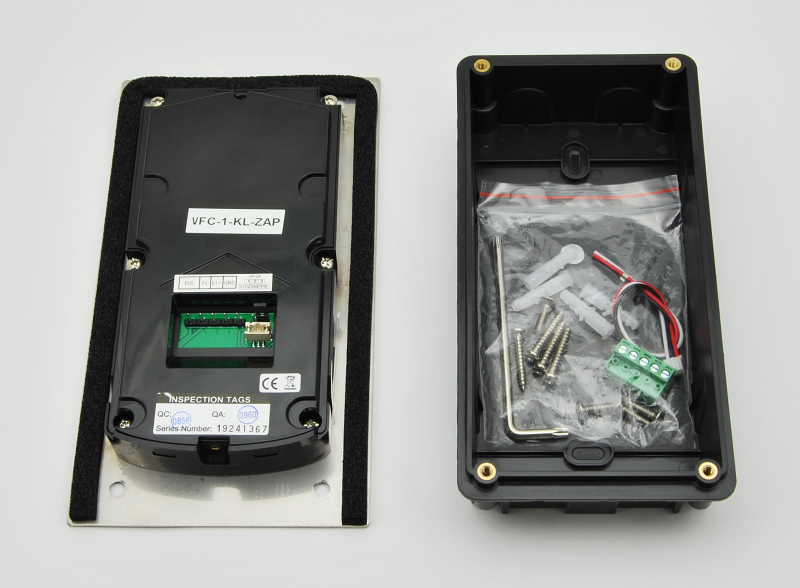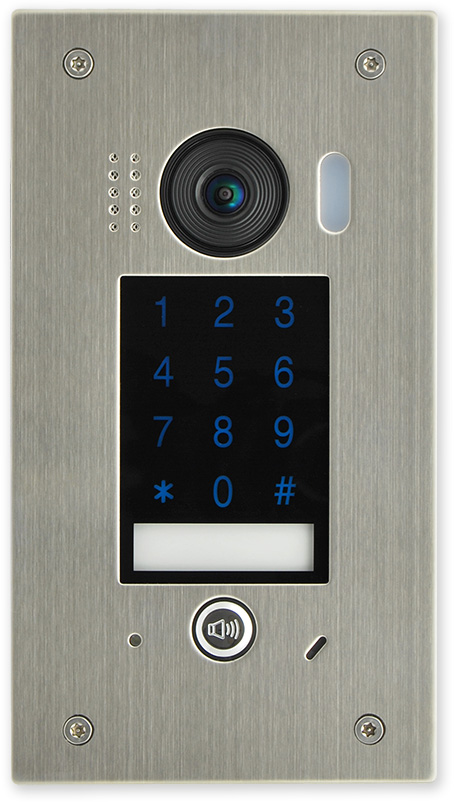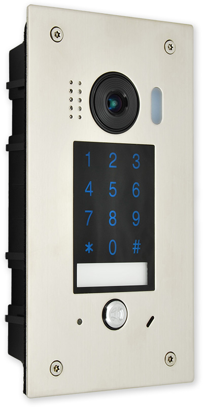 Venkovní zápustná dveřní jednotka s fisheye kamerou (170° úhel záběru) a dotykovou klávesnicí. Obsahuje kameru, LED přisvícení, tlačítko zvonku, dotykovou klávesnici pro ovládání relé dveřního zámku, reproduktor a mikrofon.