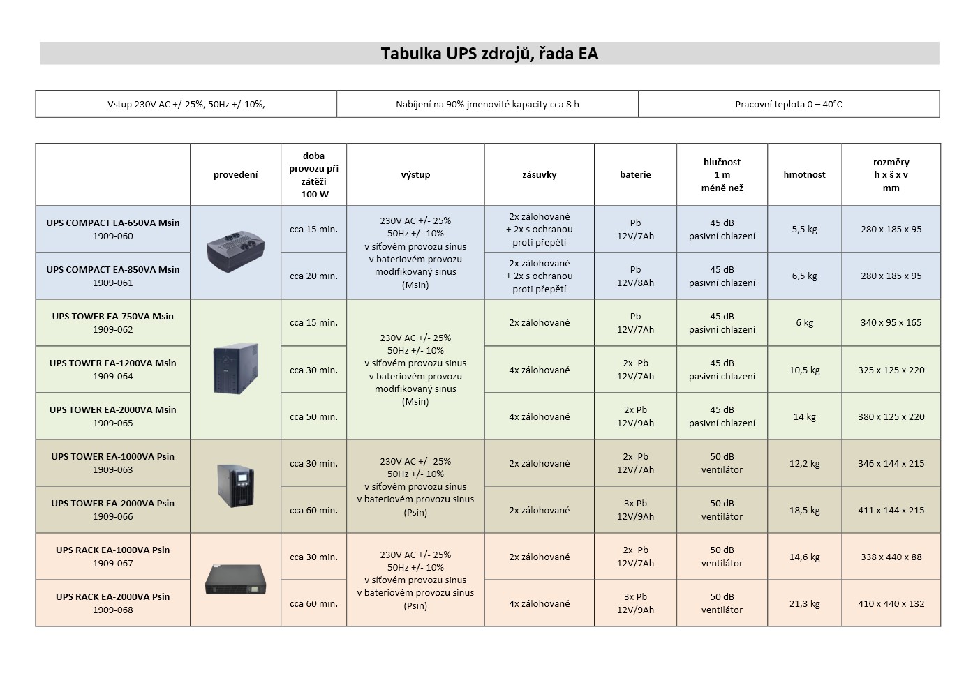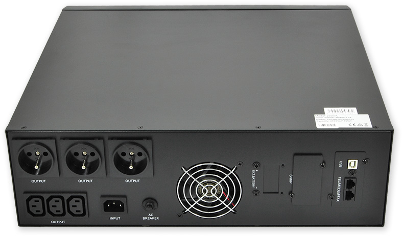 Záložní zdroj UPS RACK EA-2000VA Psin typu Line Interactive se sinusovým průběhem výstupního napětí. Rozhraní USB, komunikační software pro MS Windows. Na zadním panelu 2 konektory RJ45 pro přepěťovou ochranu připojené linky. Na čelním panelu 3 ovládací tlačítka a 4 indikační LED indikující druh provozu a informační displej.