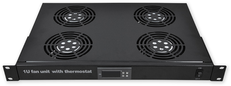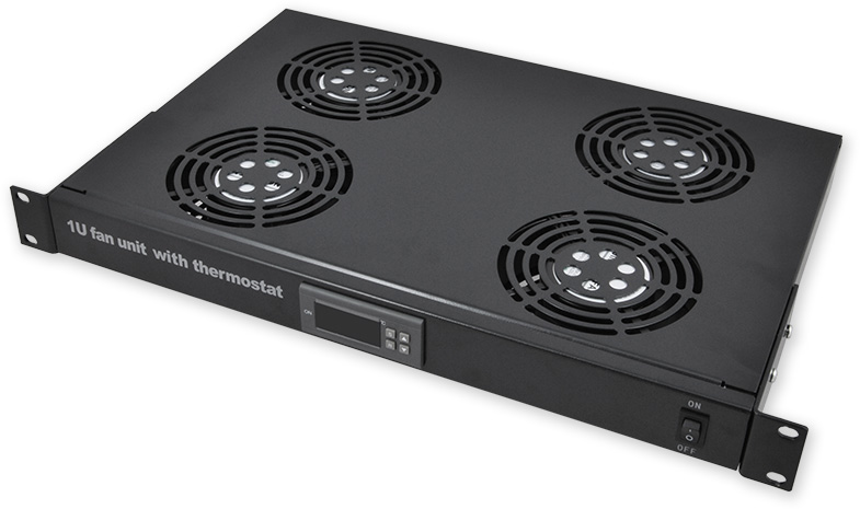 19" ventilační jednotka se čtyřmi ventilátory a digitálním termostatem, výška 1U, barva černá.