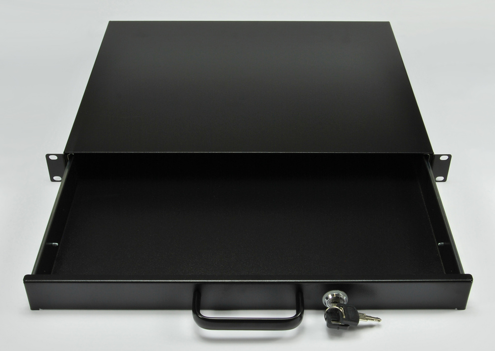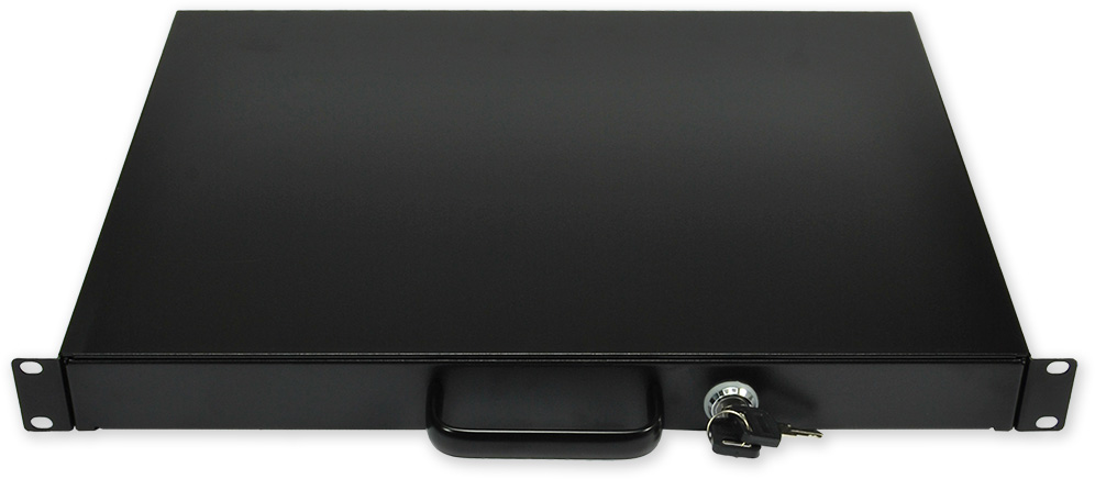19" uzamykatelná výsuvná zásuvka včetně zámku a klíčů, výška 1U, hloubka 350mm, montáž do předních ližin s nosností do 20 kg, barva černá.