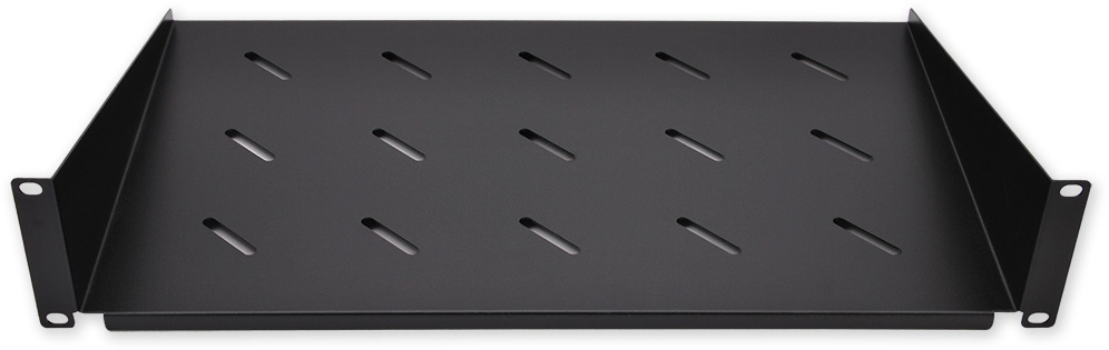 19" police s perforací, výška 1U, hloubka 350 mm, montáž do předních ližin s nosností do 40 kg, barva černá.