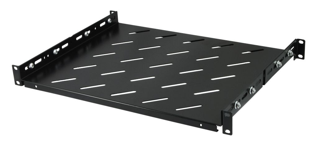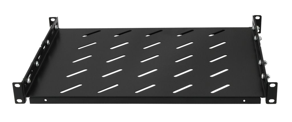 19" police s perforací, výška 1U, hloubka 350 mm, montáž do předních a zadních ližin s nosností do 60 kg, barva černá.