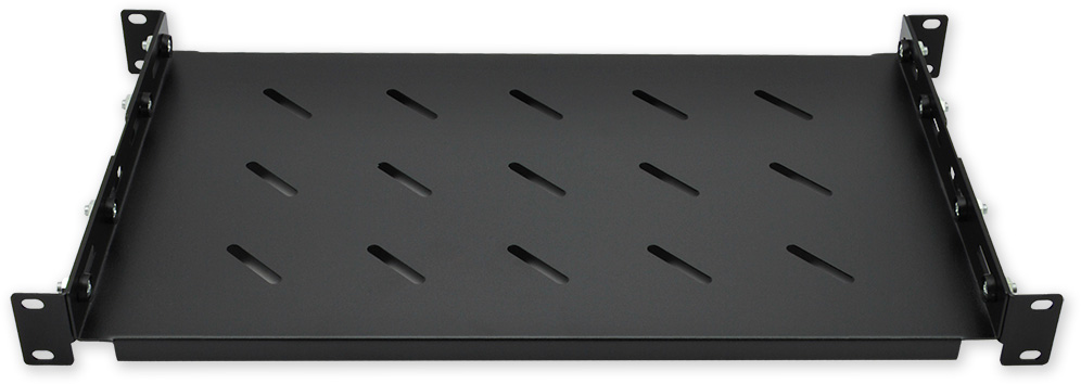 19" police s perforací, výška 1U, hloubka 250 mm, montáž do předních a zadních ližin s nosností do 40 kg, barva černá.