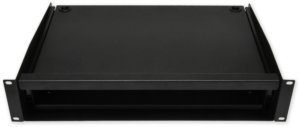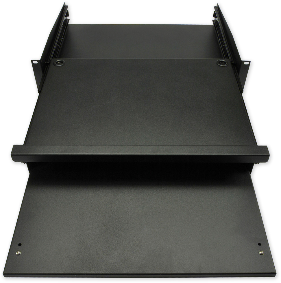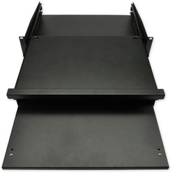 19" police pro klávesnici a myš, výška 2U, hloubka 350 mm, montáž do předních ližin s nosností do 20 kg, barva černá.