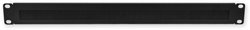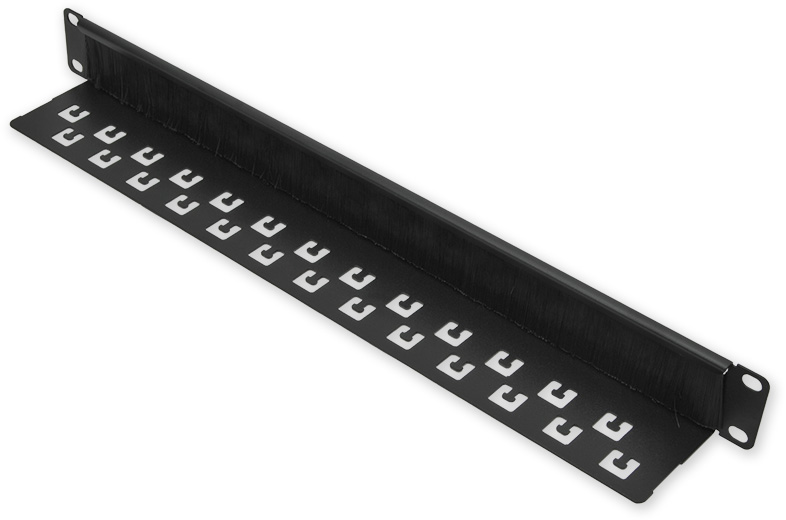 19" průchozí panel s kartáčem a vyvazovací lištou, výška 1U, barva černá.