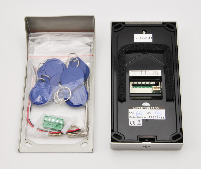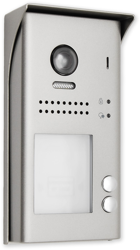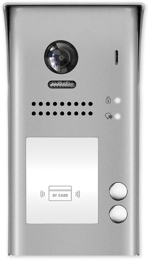 Venkovní dveřní 2 tlačítková jednotka s fisheye kamerou se 170° úhlem záběru a čtečkou karet. Obsahuje kameru, LED přisvícení, čtečku karet pro ovládání relé dveřního zámku, reproduktor a mikrofon.