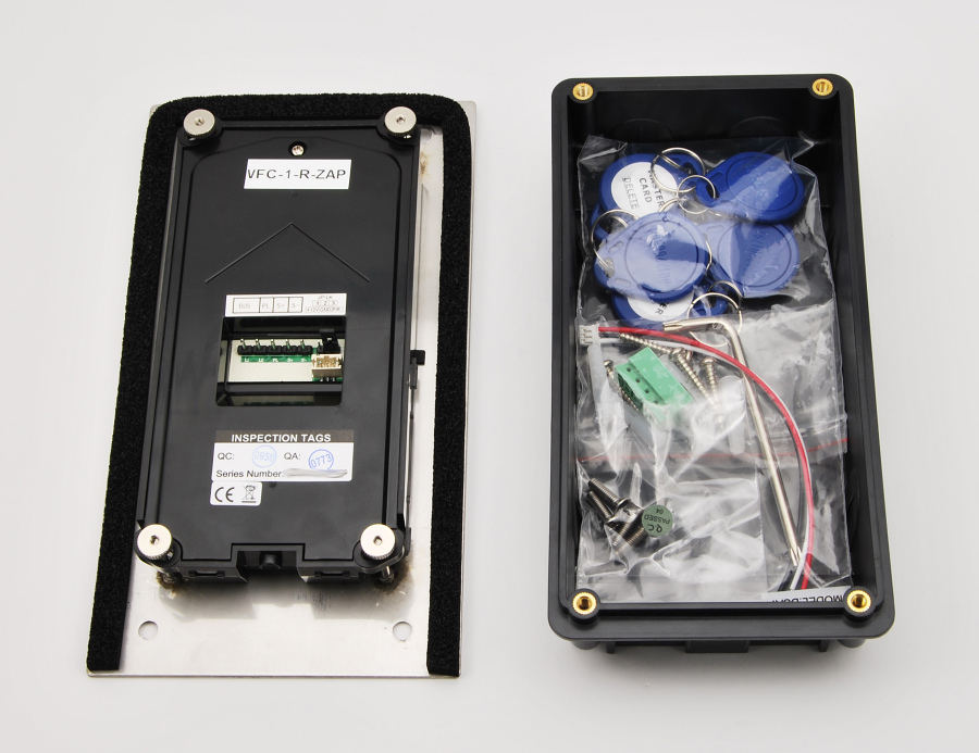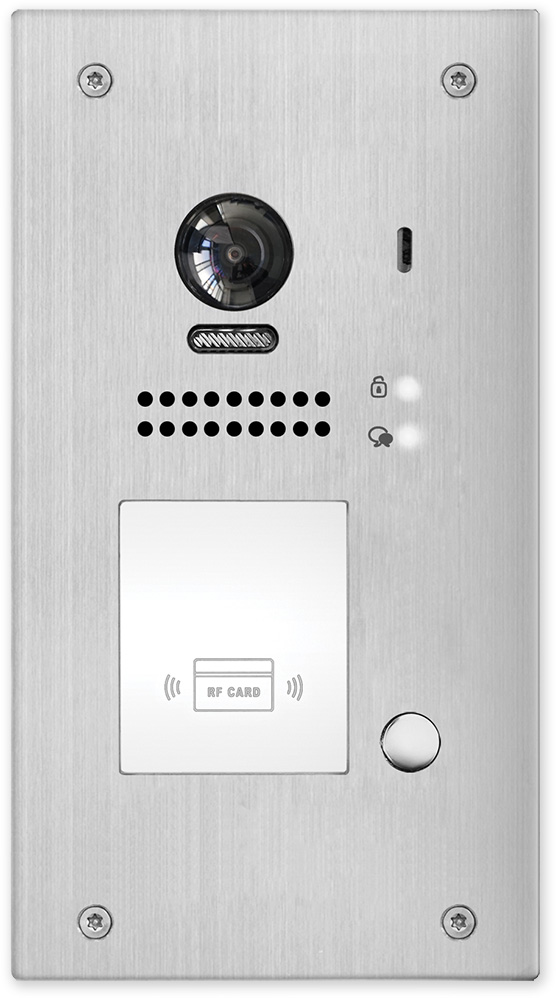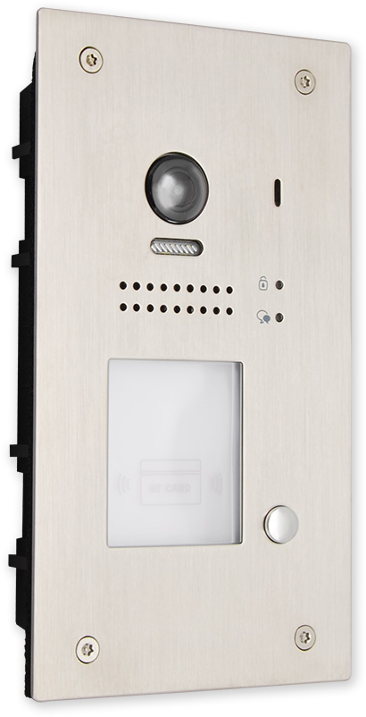 Venkovní dveřní 1 tlačítková jednotka s fisheye kamerou se 170° úhlem záběru a čtečkou karet pro zápustnou montáž. Obsahuje kameru, LED přisvícení, čtečku karet pro ovládání relé dveřního zámku, reproduktor a mikrofon.