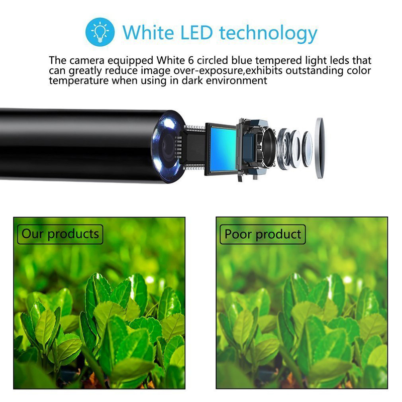 Stačí nainstalovat aplikaci/program a poté již sledovat obraz z kamery na telefonu nebo počítači. Kamera je vybavena 6 výkonnými LED. Zařízení je vhodné pro inspekci podvodních prostředí, motorových vozidel, kanalizačních potrubí a dalších těžko přístupných prostor.
