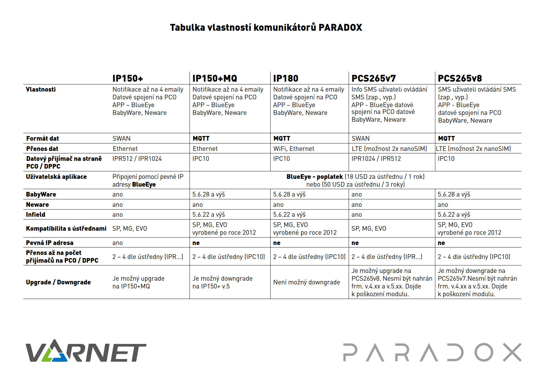 Modul určený pro komunikaci s ústřednami SP/MG/EVO přes INTERNET, při využití SWAN serveru pro vzdálené připojení není třeba veřejné IP adresy ani nastavování routování. Modul automaticky naváže spojení se SWAN serverem a umožní přímou komunikaci s mobilní uživatelskou aplikací nebo instalačním softwarem. V případě, že uživatel má na objektu pevnou veřejnou IP adresu, je možné spojení navázat přímo na tuto veřejnou adresu. Pro kryptování emailů je podpora SSL. ON-line monitorování stavu podsystémů a zón. Posílání emailů z ústředny při zapnutí/vypnutí, poplachu, poruše. Dále je možné modul využít pro plné programování instalační firmou dálkově přes LAN/internet pomocí SW BabyWare. IP150 obsahuje dva výstupy, které lze ovládat z mobilní aplikace BlueEye. Komunikace po LAN/Internet s PCO nadstavbou IPR1024.