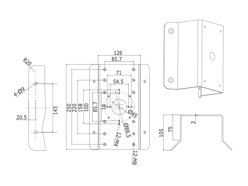Montážní adaptér instalaci kamer roh, rozměry 126 x 105 x 250 mm, nosnost 10 kg, nerezové provedení, určeno pro konzole Hikvision (DS-1272ZJ-XXX, DS-1273ZJ-XXX).
