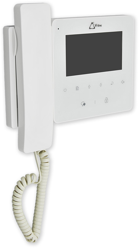 Vnitřní zobrazovací jednotka pro videotelefony řady V-LINE s barevným LCD 4,3" displejem a sluchátkem. Je určena pro povrchovou montáž. Není možné připojit tlačítko zvonku od bytových dveří.