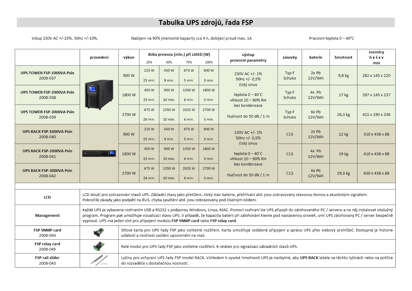 Záložní zdroj UPS TOWER FSP-2000VA Psin typu Online. Přehledný LCD displej na čelním panelu zobrazuje vstupní a výstupní hodnotu napětí, stav baterie a zatížení UPS. Místní monitoring UPS přes port USB nebo RS-232. Pro dálkový monitoring je možné doplnit SNMP kartu pro připojení do sítě ethernet, reléovou kartu s výstupy poruch a vstupy pro ovládání UPS nebo Modbus kartu pro řízení a monitorování v reálném čase prostřednictvím komunikačního portu RS-485.