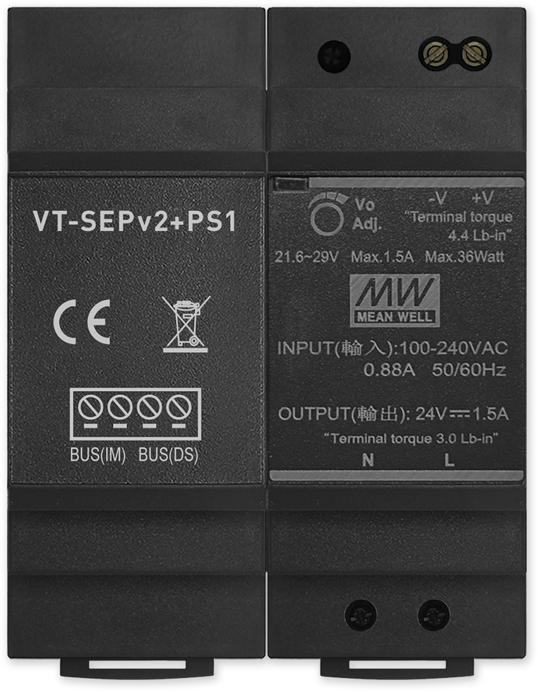 Zdroj na DIN lištu s výstupním napětím 24 V DC/1,5 A a se směšovačem napětí a dat pro videotelefony řady V-LINE. Napájení 230 V AC/0,48 A.