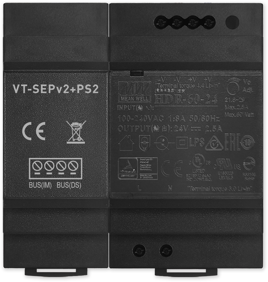 Zdroj na DIN lištu s výstupním napětím 24 V DC/2,5 A a se směšovačem napětí a dat pro videotelefony řady V-LINE. Napájení 230 V AC/0,8 A.