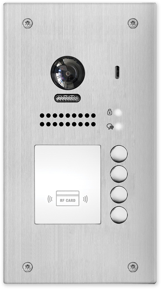 Venkovní dveřní 4 tlačítková jednotka s fisheye kamerou se 170° úhlem záběru a čtečkou karet pro zápustnou montáž. Obsahuje kameru, LED přisvícení, čtečku karet pro ovládání relé dveřního zámku, reproduktor a mikrofon.
