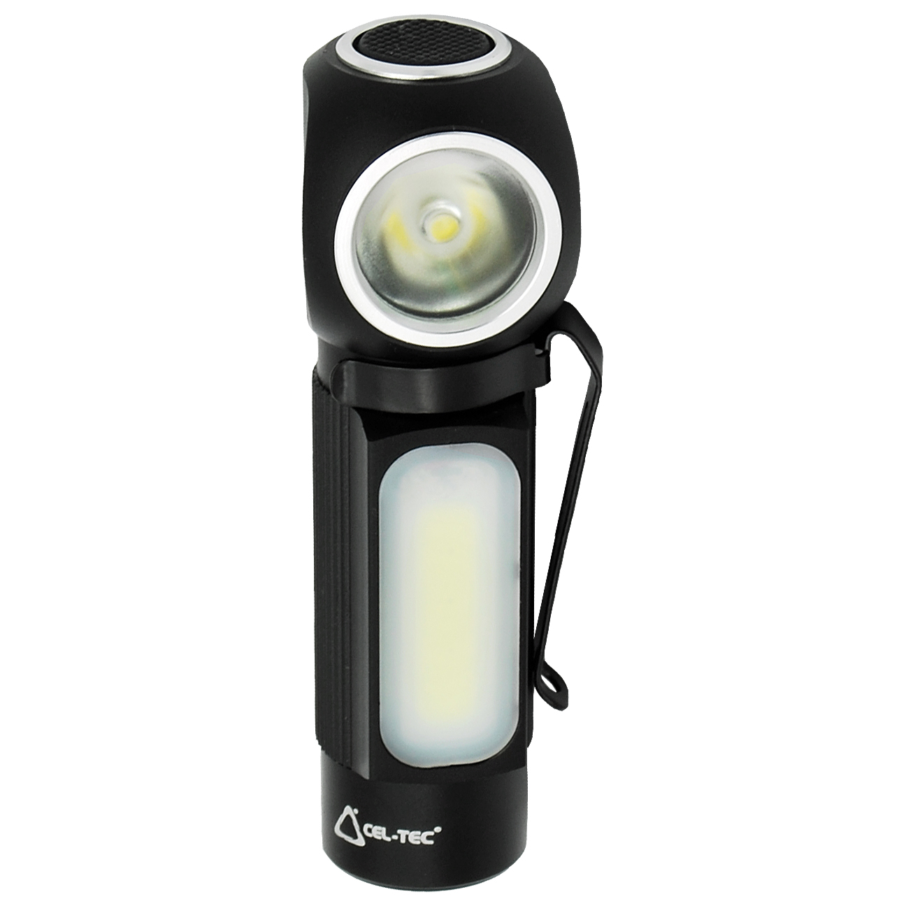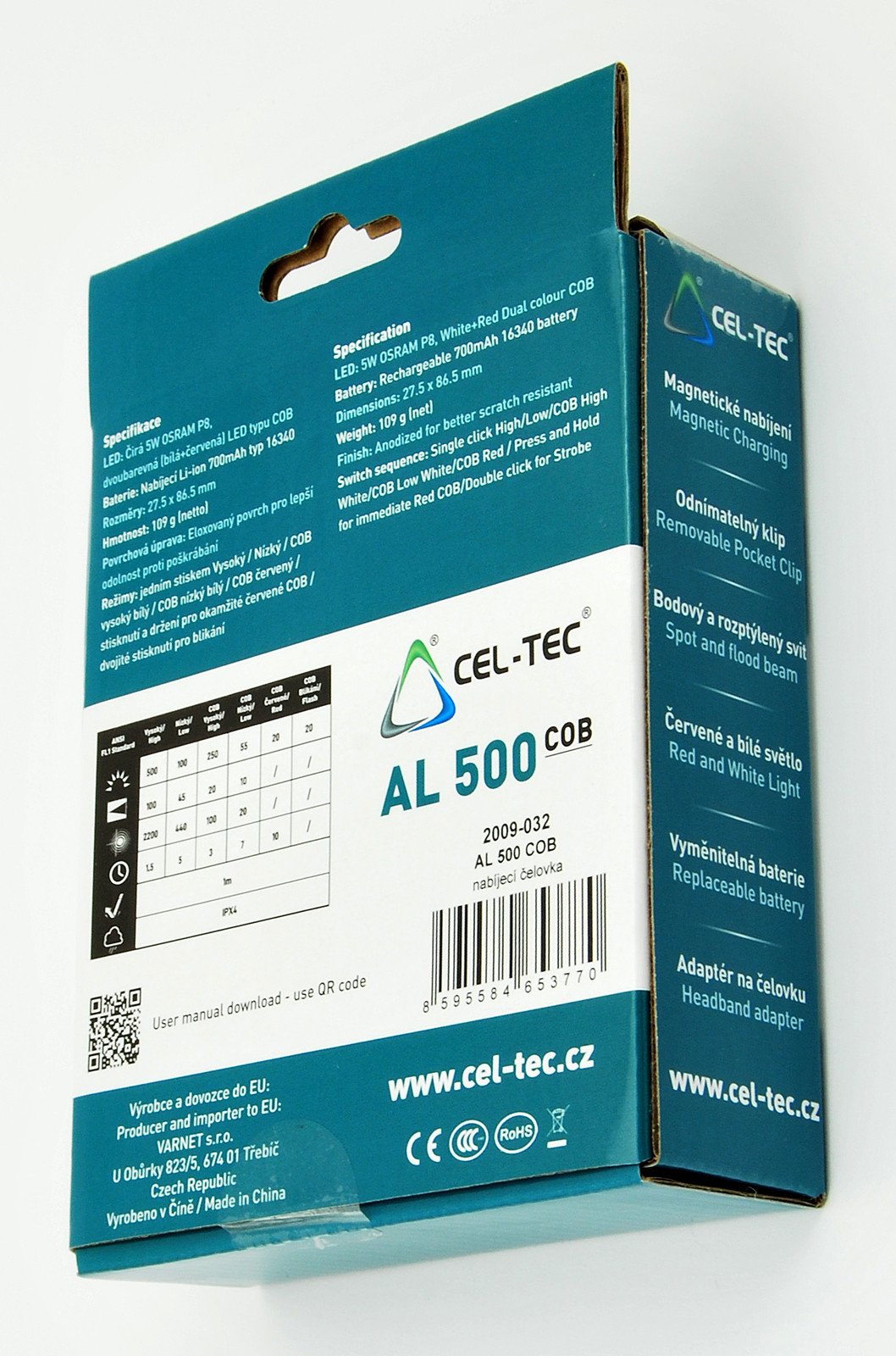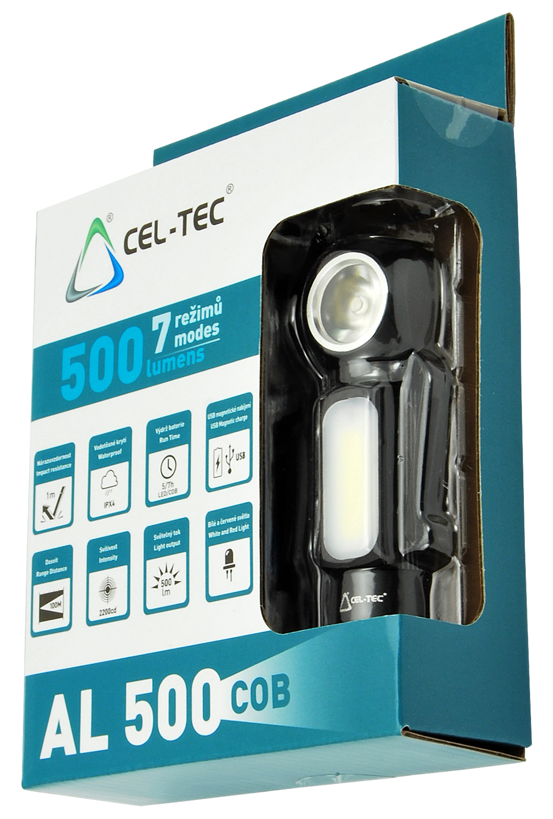 Nabíjecí úhlová čelovka CEL-TEC AL500 COB je velice univerzální svítilna díky variabilním možnostem upevnění a použití. Je vybavena dvěma druhy světelných zdrojů, jedním z nich je tradiční bodová LED o výkonu 500 lm a druhým takzvaná COB LED (250 lm), která najde uplatnění v situacích, kdy není potřeba co nejdelší dosvit, ale naopak rovnoměrně osvítit větší bezprostřední plochu, například pracovní stůl apod. Mimo čirého světla dokáže COB LED svítit také červeně.